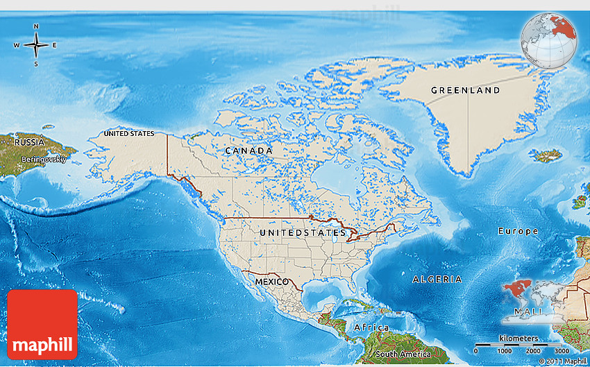 The value of Maphill lies in the possibility to look at the same area from several perspectives. Maphill presents the map of North America in a wide variety of map types and styles.