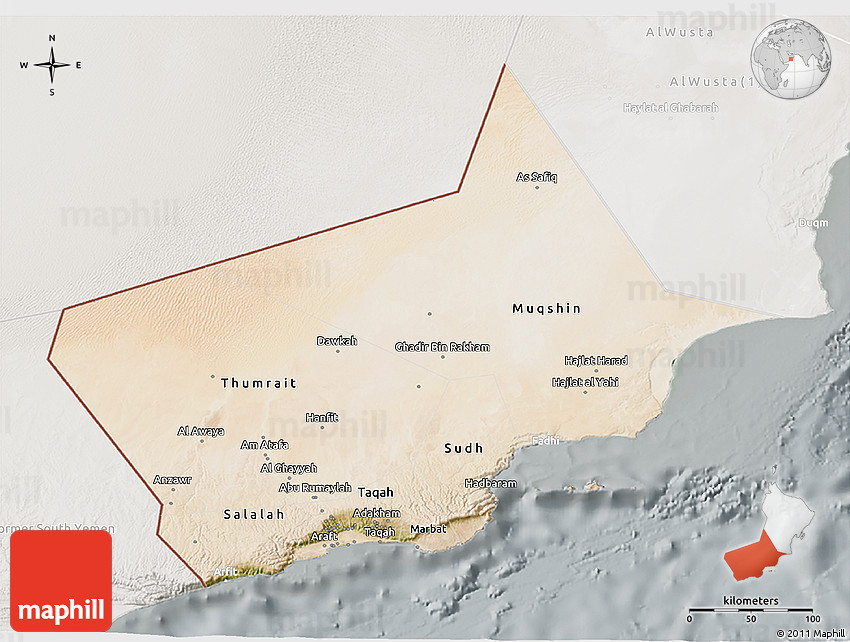 Maphill is a collection of map images. This view of Dhofar at an angle of 60° is one of these images. Click on the Detailed button under the map for a more comprehensive map.