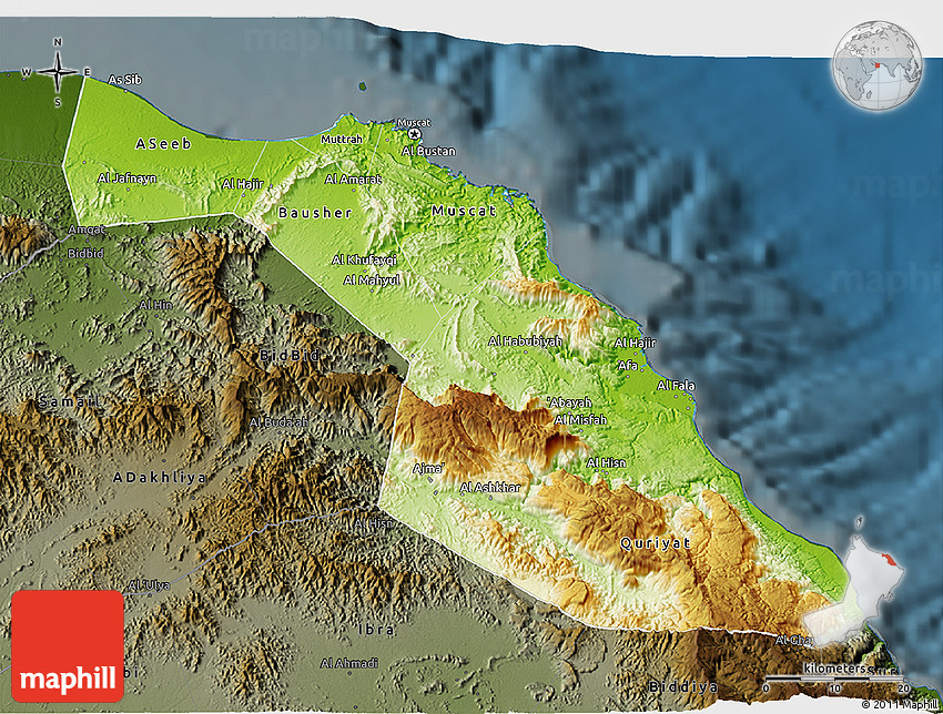 Physical map illustrates the mountains, lowlands, oceans, lakes and rivers and other physical landscape features of Muscat. Differences in land elevations relative to the sea level are represented by color.