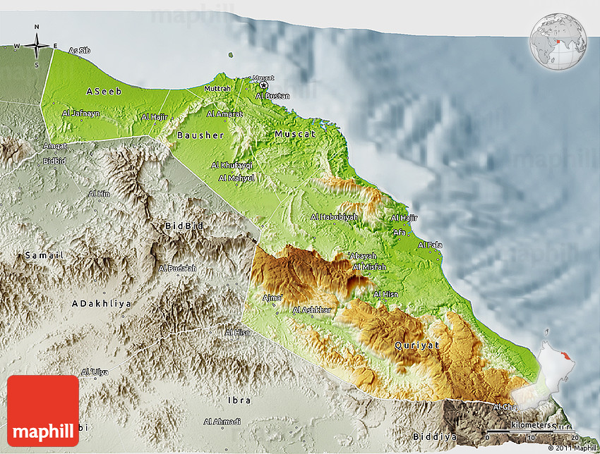 Physical map illustrates the mountains, lowlands, oceans, lakes and rivers and other physical landscape features of Muscat. Differences in land elevations relative to the sea level are represented by color.
