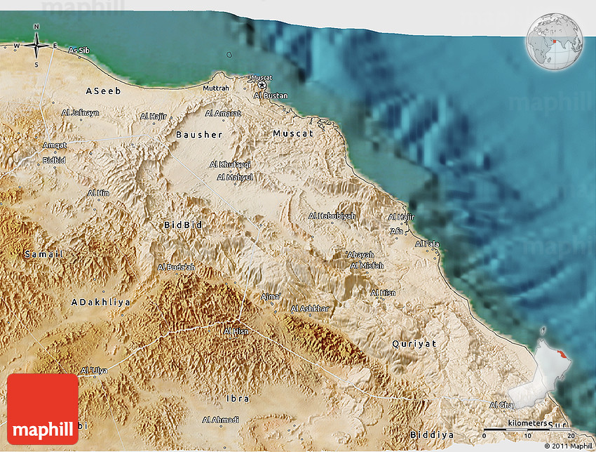 The value of Maphill lies in the possibility to look at the same area from several perspectives. Maphill presents the map of Muscat in a wide variety of map types and styles.