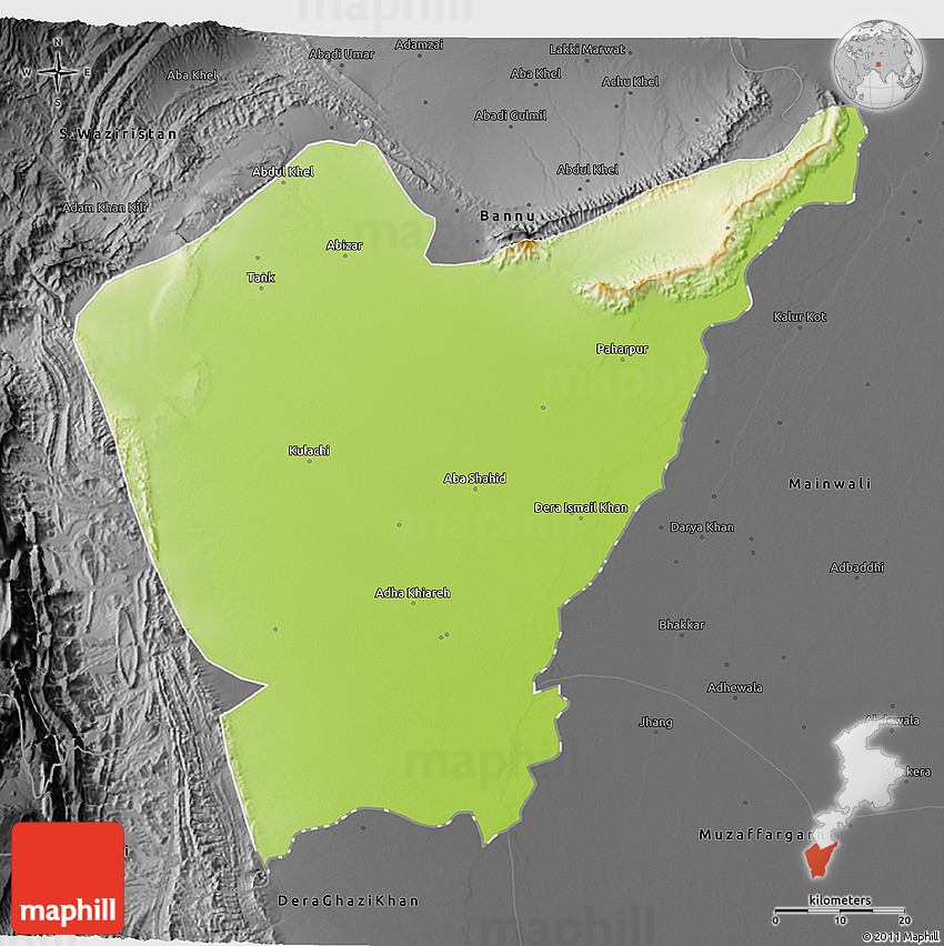 Physical map illustrates the mountains, lowlands, oceans, lakes and rivers and other physical landscape features of Dera Ismail Khan. Differences in land elevations relative to the sea level are represented by color.