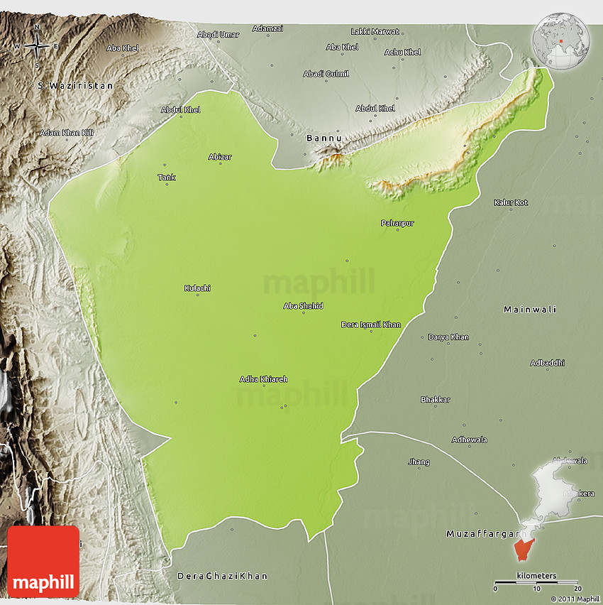 Physical map illustrates the mountains, lowlands, oceans, lakes and rivers and other physical landscape features of Dera Ismail Khan. Differences in land elevations relative to the sea level are represented by color.