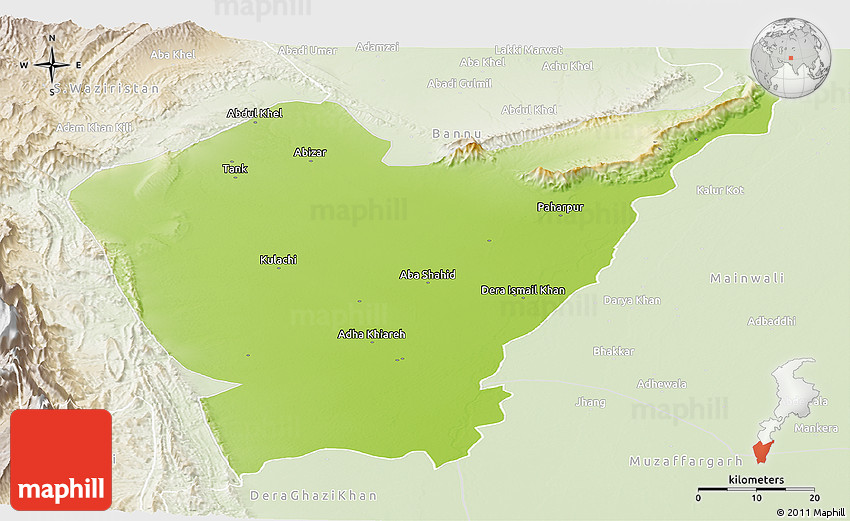Physical map illustrates the mountains, lowlands, oceans, lakes and rivers and other physical landscape features of Dera Ismail Khan. Differences in land elevations relative to the sea level are represented by color.