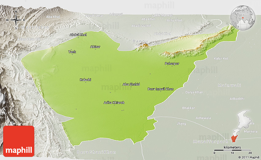 Physical map illustrates the mountains, lowlands, oceans, lakes and rivers and other physical landscape features of Dera Ismail Khan. Differences in land elevations relative to the sea level are represented by color.