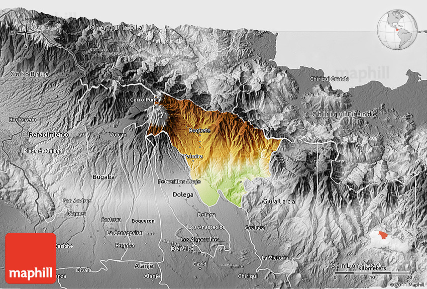 The 3D physical map represents one of several map types and styles available. Look at Boquete, Chiriqui, Panama from different perspectives.