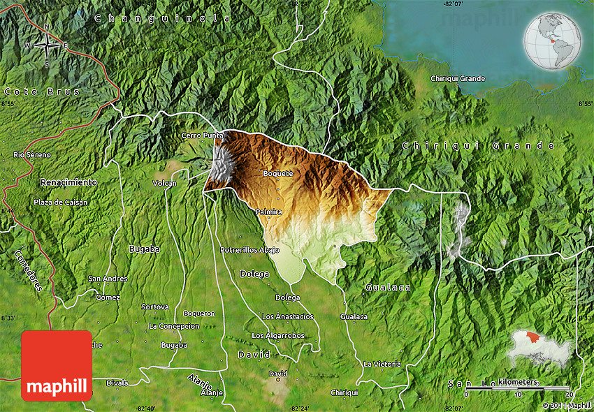 Each map type offers different information and each map style is designed for a different purpose. Read about the styles and map projection used in the above map (Physical Map of Boquete, satellite outside).