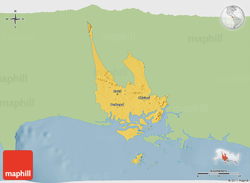 The 3D savanna style map represents one of several map types and styles available. Look at David, Chiriqui, Panama from different perspectives.
