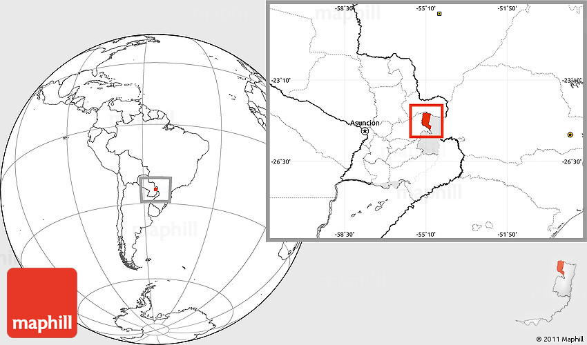 Maphill is a collection of map images. This image combines a blank map with the globe centered on Itakyry. Use the buttons under the image to switch to different map types.