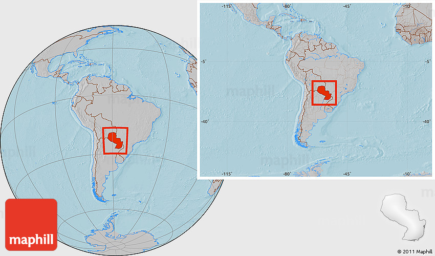 Maphill is a collection of map images. This image combines a gray map with the globe centered on Paraguay. Use the buttons under the image to switch to different map types.