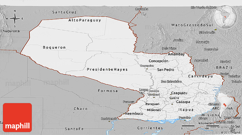 The grey colored map. Paraguay is highlighted in white. This color scheme is similar to silver styled maps, but compared to the latter, a darker shade of gray is used.