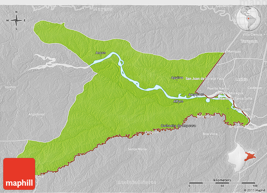 The 3D physical map represents one of several map types and styles available. Look at Mar.R.Castilla, Loreto, Peru from different perspectives.
