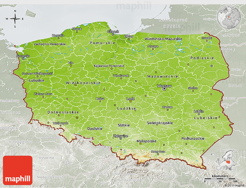 Physical map illustrates the mountains, lowlands, oceans, lakes and rivers and other physical landscape features of Poland. Differences in land elevations relative to the sea level are represented by color.