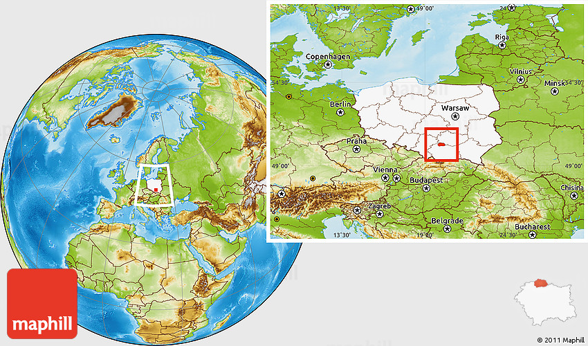 Maphill is a collection of map images. This image combines a physical map with the globe centered on Miechow. Use the buttons under the image to switch to different map types.