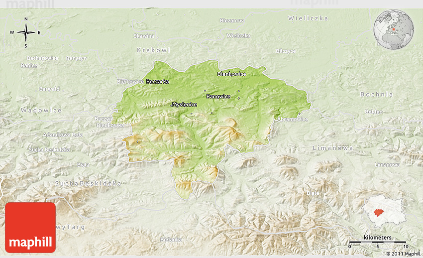 The 3D physical map represents one of several map types and styles available. Look at Myslenice, Malopolske, Poland from different perspectives.