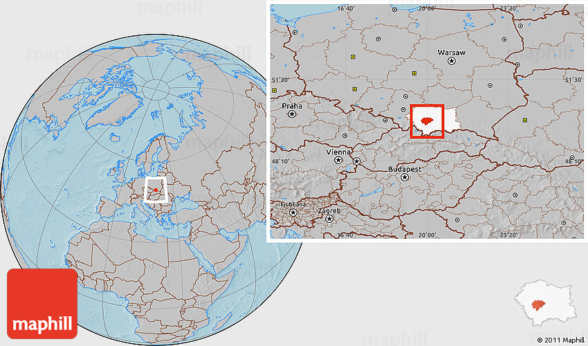 Maphill is a collection of map images. This image combines a gray map with the globe centered on Myslenice. Use the buttons under the image to switch to different map types.