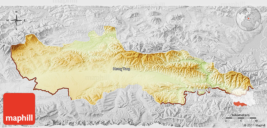Physical map illustrates the mountains, lowlands, oceans, lakes and rivers and other physical landscape features of Nowy Targ. Differences in land elevations relative to the sea level are represented by color.