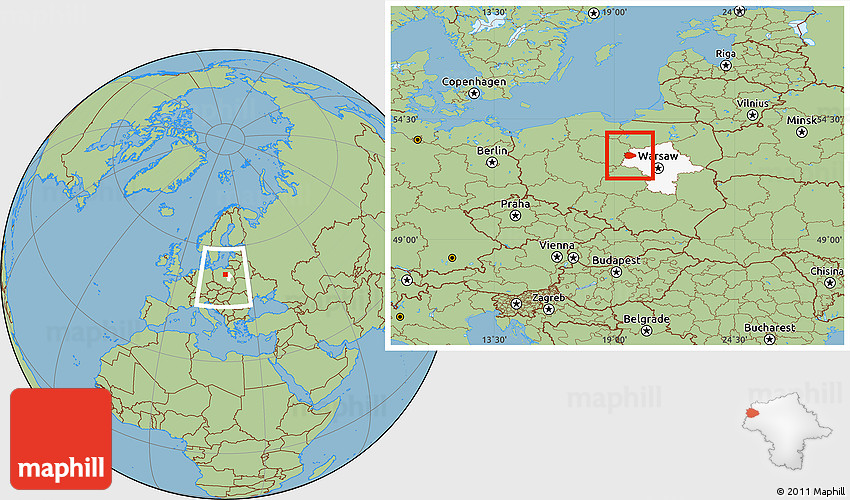 The location map of Sierpc combines two projections: the orthographic azimuthal projection for the globe and the simple geographic projection for the rectangular part of the map. Geographic projection has straight meridians and parallels, each degree of latitude and longitude is the same size over the entire world map.