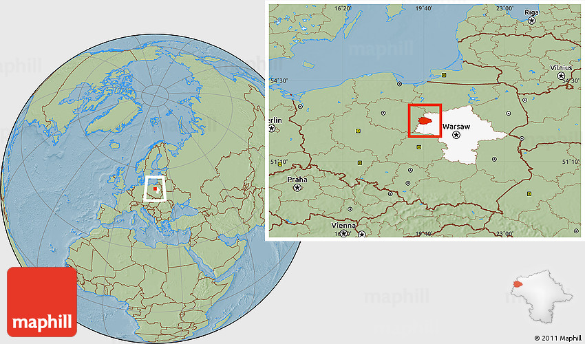The location map of Sierpc combines two projections: the orthographic azimuthal projection for the globe and the simple geographic projection for the rectangular part of the map. Geographic projection has straight meridians and parallels, each degree of latitude and longitude is the same size over the entire world map.