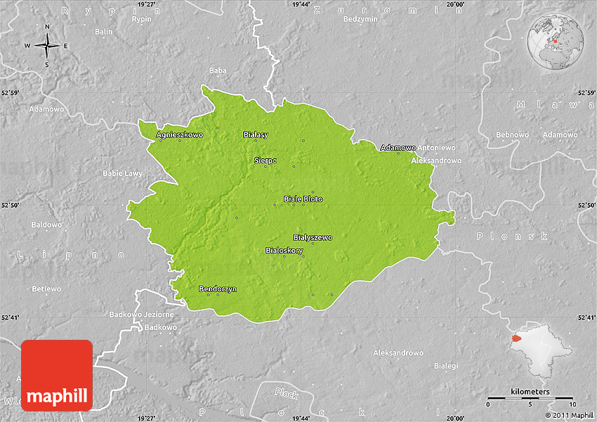 Physical map illustrates the mountains, lowlands, oceans, lakes and rivers and other physical landscape features of Sierpc. Differences in land elevations relative to the sea level are represented by color.