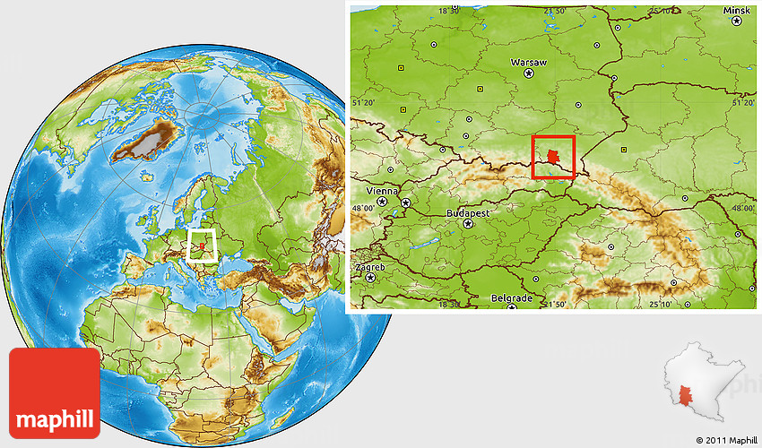 Maphill is a collection of map images. This image combines a physical map with the globe centered on Krosno I. Use the buttons under the image to switch to different map types.