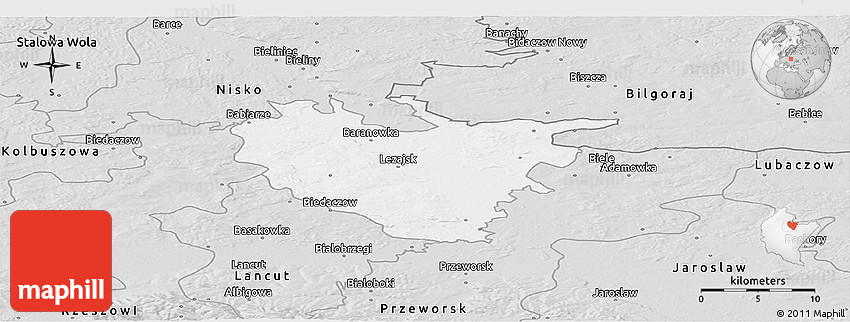 The panoramic silver style map represents one of several map types and styles available. Look at Lezajsk, Podkarpackie, Poland from different perspectives.