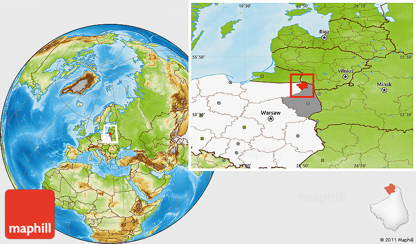Maphill is a collection of map images. This image combines a physical map with the globe centered on Suwalki I. Use the buttons under the image to switch to different map types.
