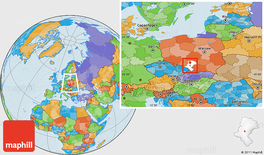 Maphill is a collection of map images. This image combines a political map with the globe centered on Ruda Slaska. Use the buttons under the image to switch to different map types.