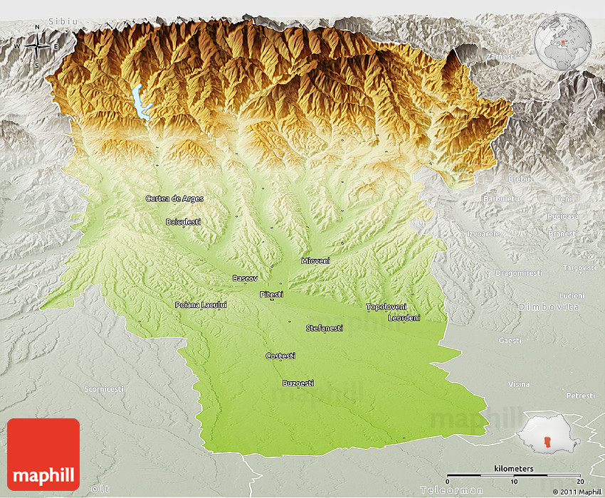 The panoramic physical map represents one of many map types and styles available. Look at Arges from different perspectives.