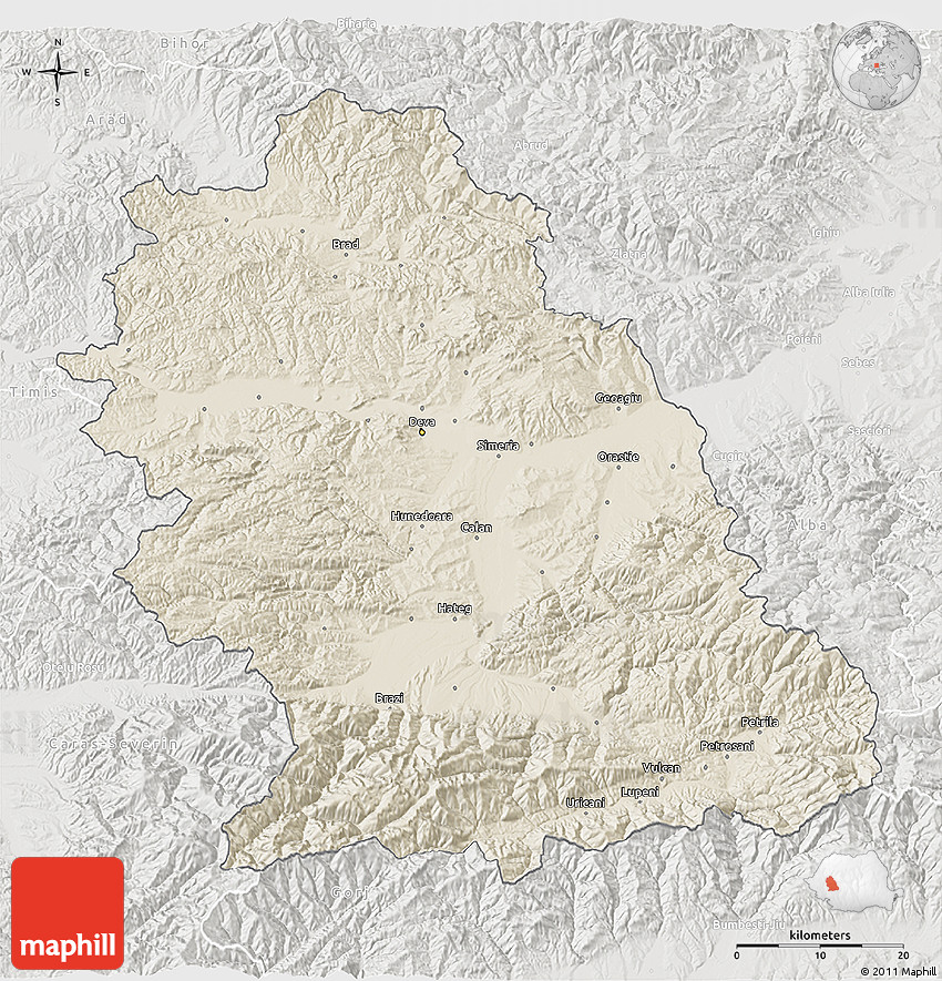 Shaded relief map shows landscape features, such as mountains, valleys and plateaus. Flat areas are smooth on the map, areas with steep slopes and mountains appear more rough. The above map of Hunedoara was created using a digital elevation model.