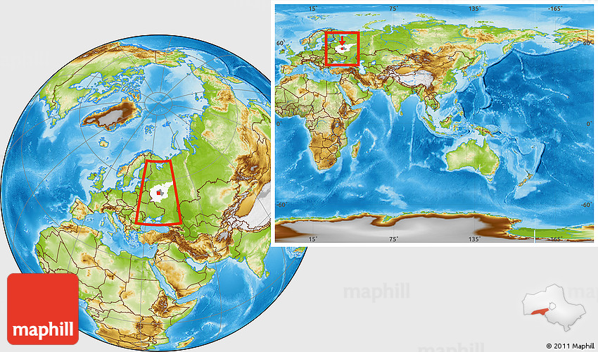 Maphill is a collection of map images. This image combines a physical map with the globe centered on Naro-Fominskiy. Use the buttons under the image to switch to different map types.
