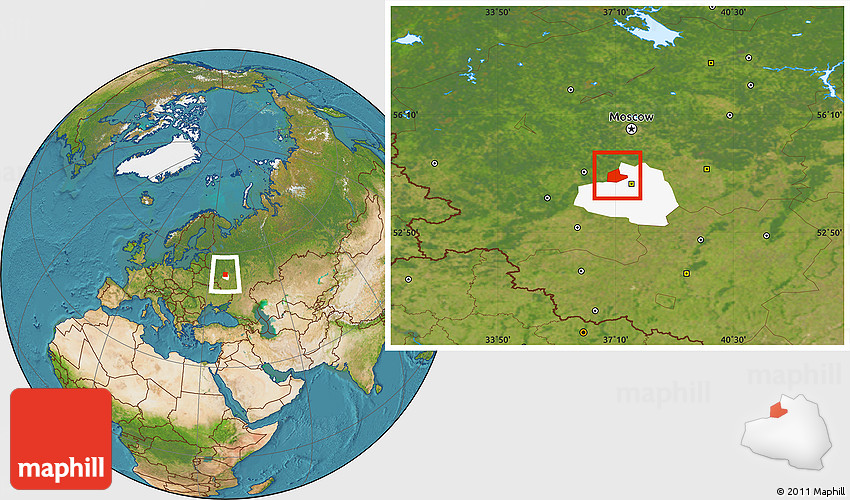 Maphill is a collection of map images. This image combines a satellite map with the globe centered on Aleksinskiy. Use the buttons under the image to switch to different map types.