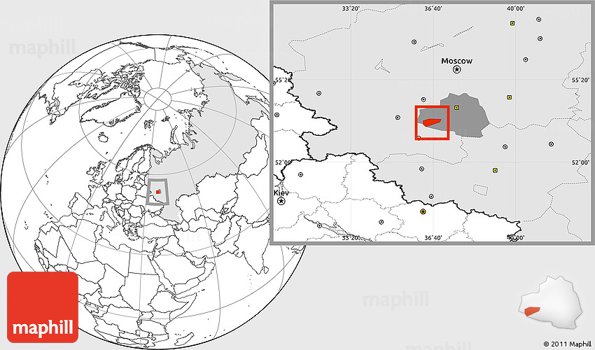 The blank location map represents one of several map types available. Look at Arsenyevskiy, Tula Oblast, Central, Russia from different perspectives.
