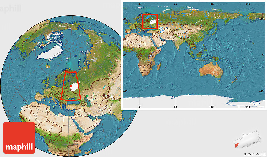 Maphill is a collection of map images. This image combines a satellite map with the globe centered on Zapadnodvinskiy. Use the buttons under the image to switch to different map types.