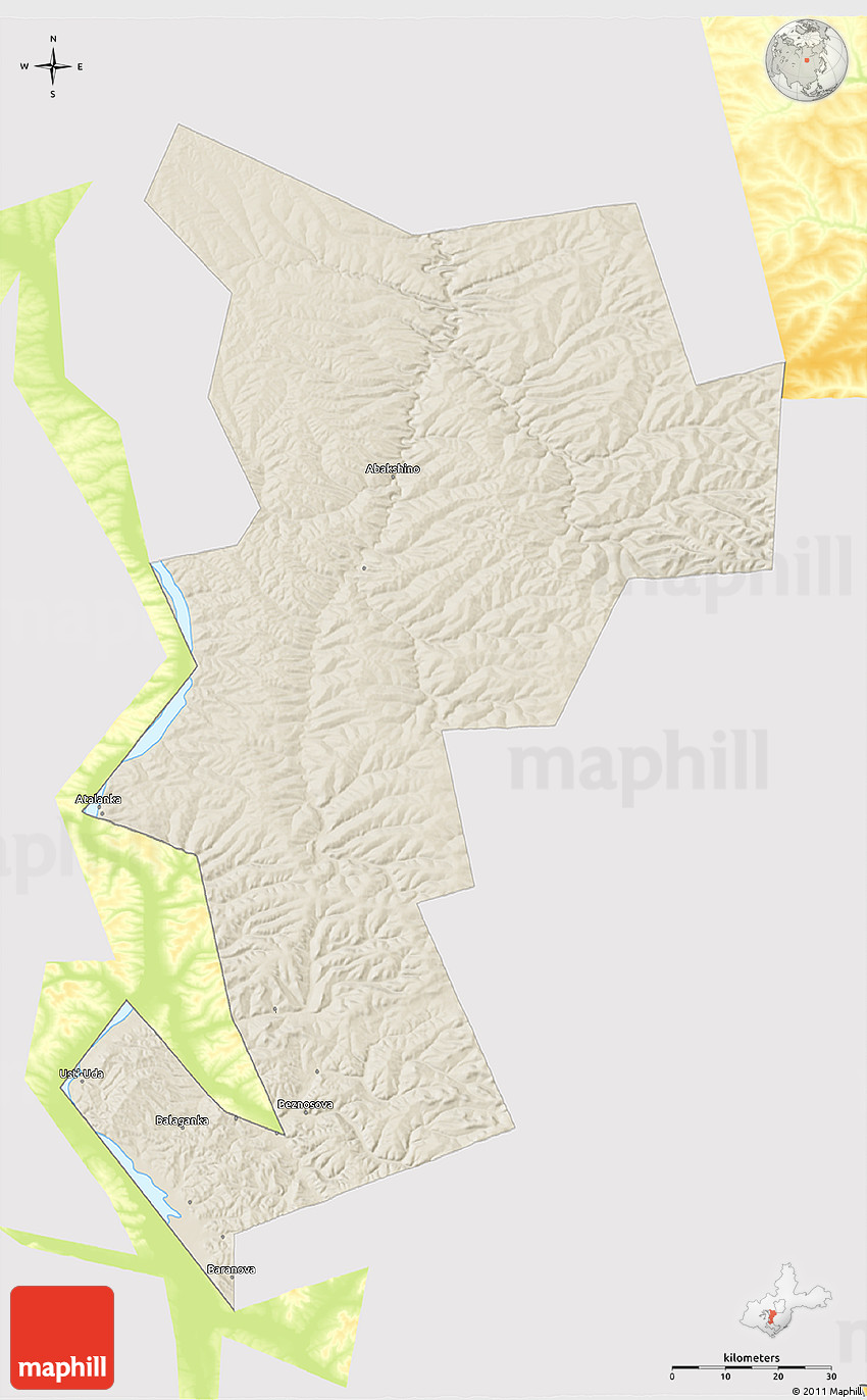 Shaded relief map shows landscape features, such as mountains, valleys and plateaus. Flat areas are smooth on the map, areas with steep slopes and mountains appear more rough. The above map of Ust-Udinskiy was created using a digital elevation model.