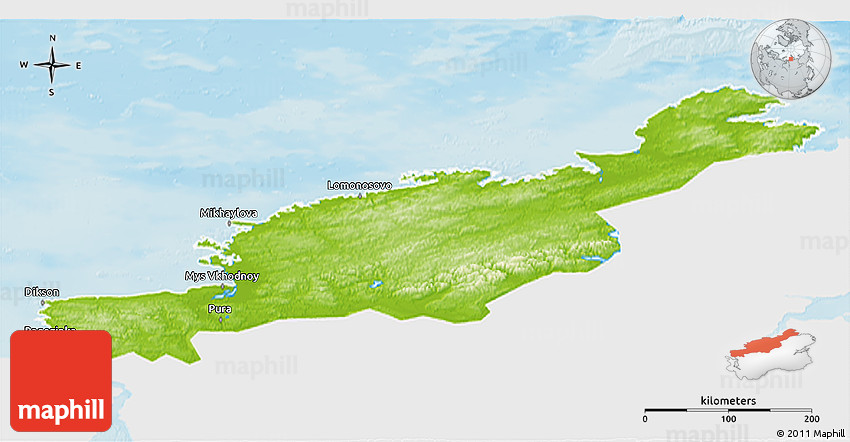 The 3D physical map represents one of several map types available. Look at Diksonskiy, Taymyr Autonomous Okrug, Eastern Siberia, Russia from different perspectives.