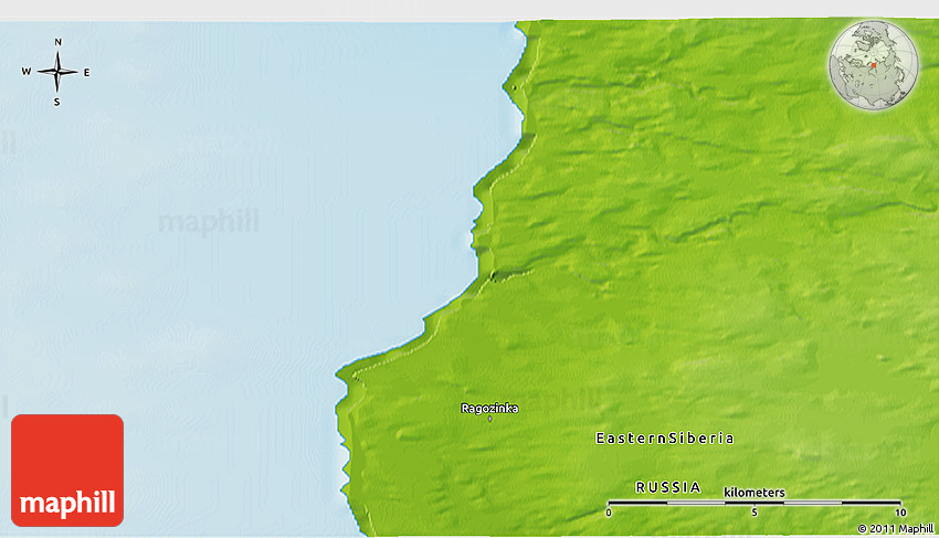 The 3D physical map represents one of many map types and styles available. Look at Ragozinka, Diksonskiy, Taymyr Autonomous Okrug, Eastern Siberia, Russia from different perspectives.