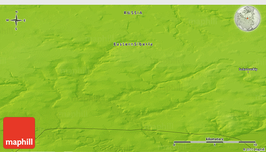 Physical map illustrates the mountains, lowlands, oceans, lakes and rivers and other physical landscape features of Sokolovskiy. Differences in land elevations relative to the sea level are represented by color.