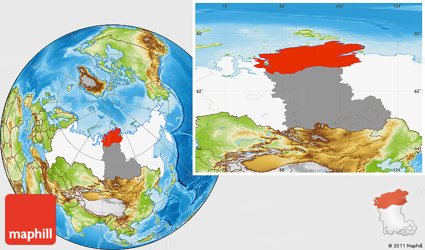 Maphill is a collection of map images. This image combines a physical map with the globe centered on Taymyr Autonomous Okrug. Use the buttons under the image to switch to different map types.