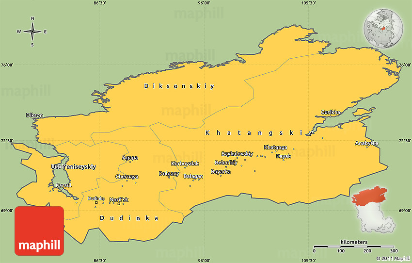 The simple savanna style outline map represents one of several map types and styles available. Look at Taymyr Autonomous Okrug, Eastern Siberia, Russia from different perspectives.