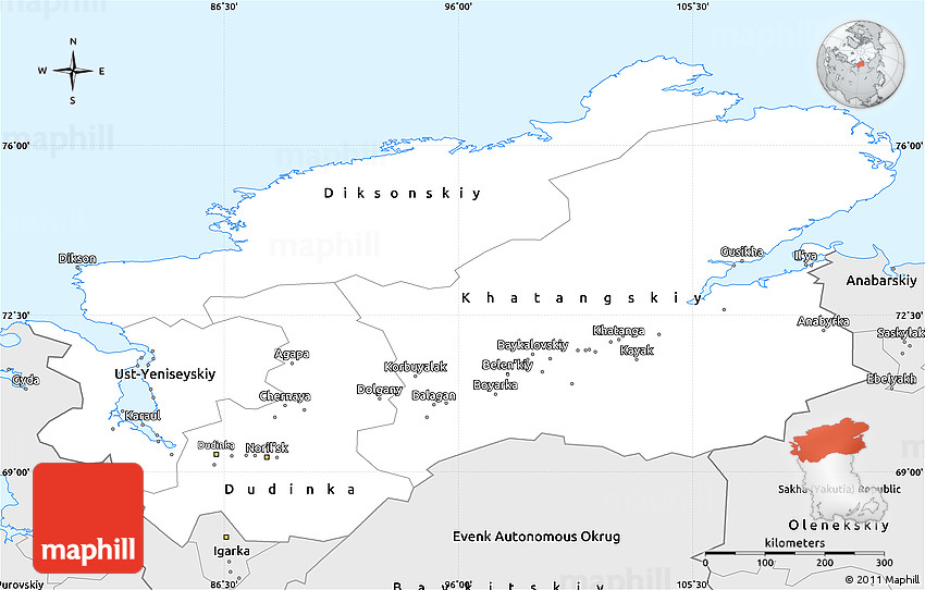 The simple silver style outline map represents one of several map types and styles available. Look at Taymyr Autonomous Okrug, Eastern Siberia, Russia from different perspectives.