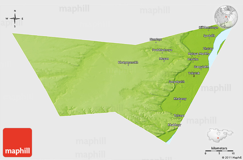 Physical map illustrates the mountains, lowlands, oceans, lakes and rivers and other physical landscape features of Yakutsk. Differences in land elevations relative to the sea level are represented by color.