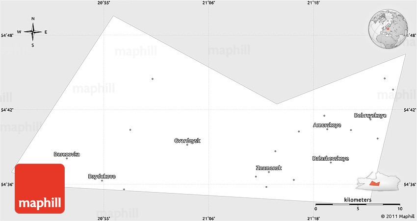 The silver style outline map represents one of several map types available. Look at Gvardeyskiy, Kaliningrad Oblast, Kaliningrad, Russia from different perspectives.