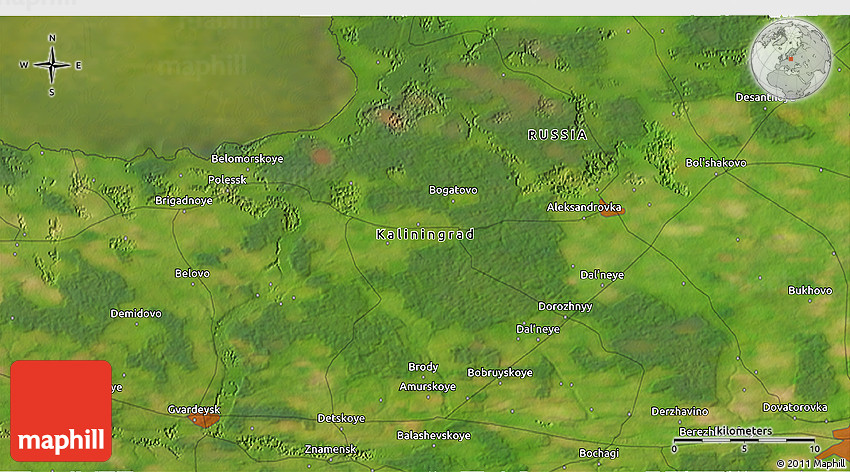 The 3D satellite map represents one of many map types and styles available. Look at Mezhdules'ye, Polesskiy, Kaliningrad Oblast, Kaliningrad, Russia from different perspectives.