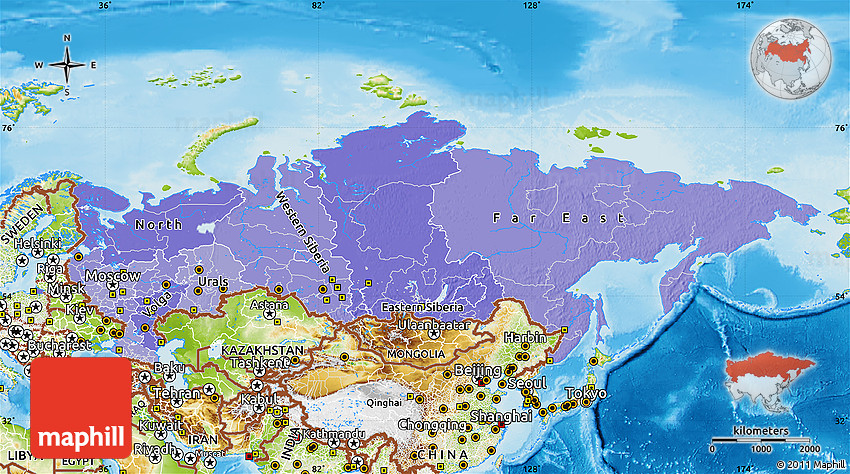 The panoramic political shades map represents one of many map types and styles available. Look at Russia from different perspectives.