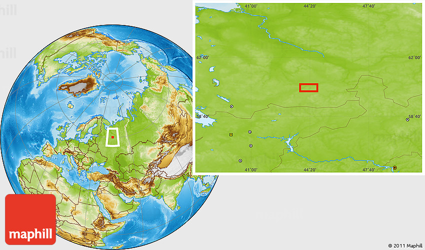Maphill is a collection of map images. This image combines a physical map with the globe centered on Nyuksenitsa. Use the buttons under the image to switch to different map types.