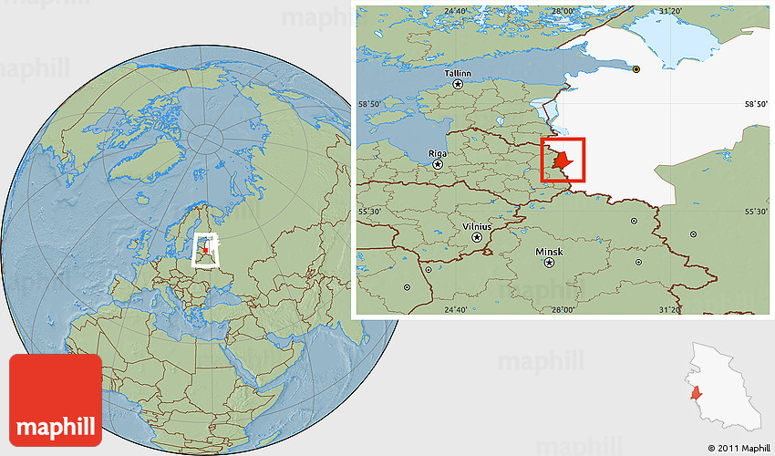 The location map of Pytalovskiy combines two projections: the orthographic azimuthal projection for the globe and the simple geographic projection for the rectangular part of the map. Geographic projection has straight meridians and parallels, each degree of latitude and longitude is the same size over the entire world map.