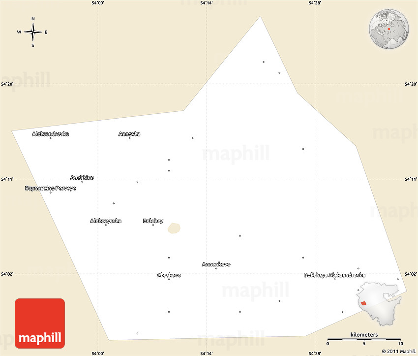 The classic style outline map represents one of several map types available. Look at Belebeyevskiy, Bashkiria, Urals, Russia from different perspectives.