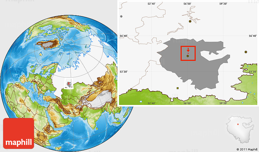 Maphill is a collection of map images. This image combines a physical map with the globe centered on Blagoveshchensk. Use the buttons under the image to switch to different map types.