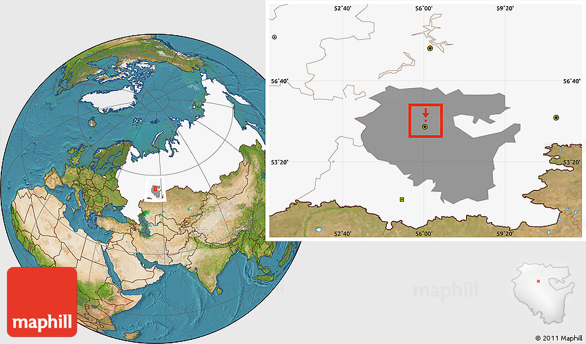Maphill is a collection of map images. This image combines a satellite map with the globe centered on Blagoveshchensk. Use the buttons under the image to switch to different map types.